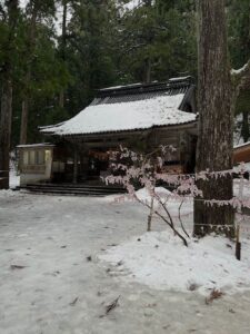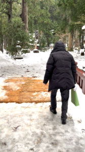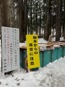 大きなスギの木が並ぶ境内は、雪が溶けにくいのです👞💦